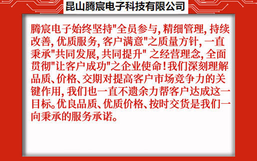 昆山騰宸電子科技有限公司位于中國線路板加工之都昆山千燈,公司專注于電路板研發(fā)設(shè)計(jì)、PCB抄板、元器件采購、SMT貼片加工、組裝測(cè)試,為客戶提供一站式電子制造服務(wù)。騰宸電子始終堅(jiān)持"全員參與,精細(xì)管理,持續(xù)改善,優(yōu)質(zhì)服務(wù),客戶滿意"之質(zhì)量方針,一直秉承"共同發(fā)展,共同提升" 之經(jīng)營理念,全面貫徹"讓客戶成功"之企業(yè)使命!我們深刻理解品質(zhì)、價(jià)格、交期對(duì)提高客戶市場(chǎng)競爭力的關(guān)鍵作用,我們也一直不遺余力幫客戶達(dá)成這一目標(biāo)。優(yōu)良品質(zhì)、優(yōu)質(zhì)價(jià)格、按時(shí)交貨是我們一向秉承的服務(wù)承諾。 ...